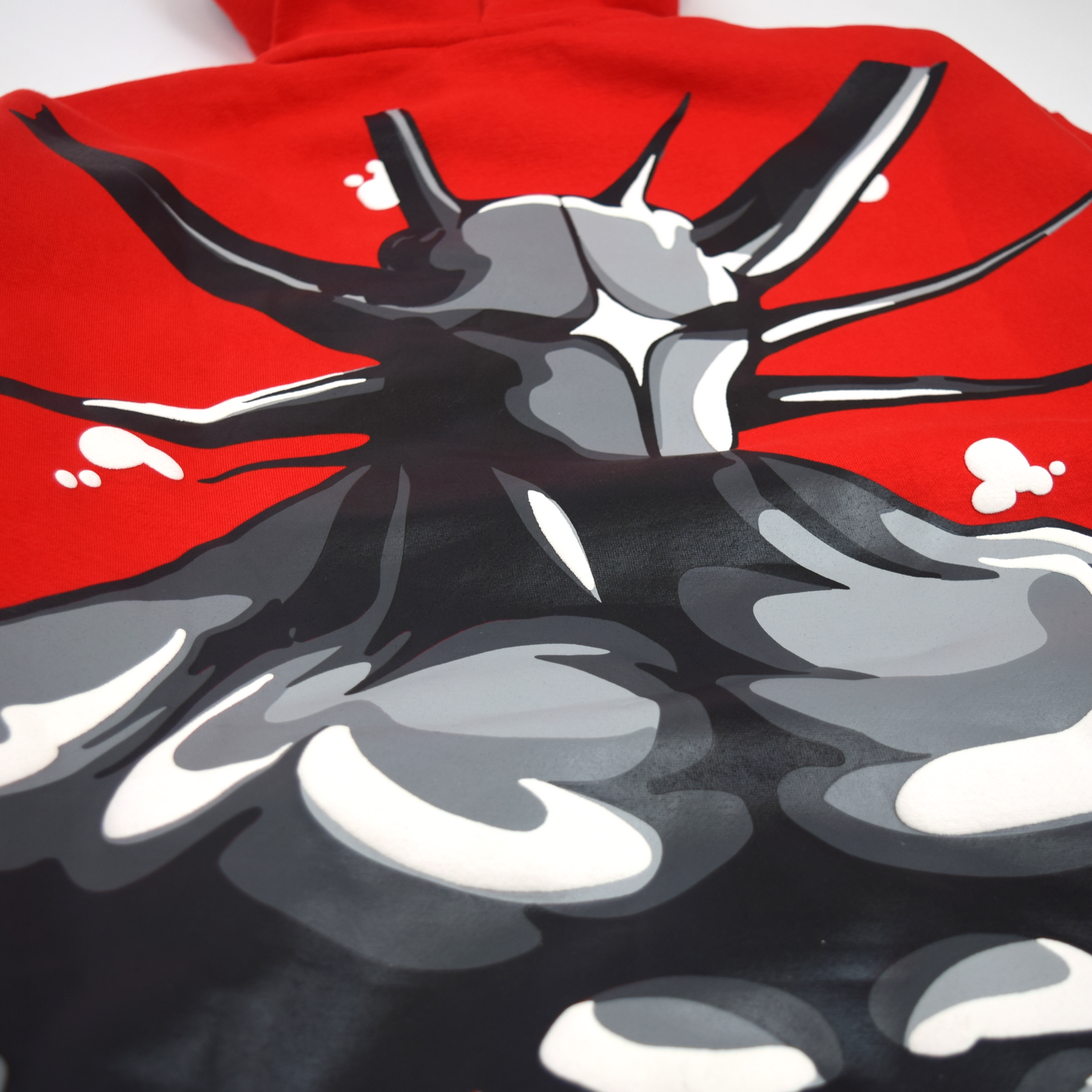 On the back, an abstract drip-inspired graphic in puff print continues the theme of bold expression. The vibrant orange design mirrors the front, ensuring a cohesive yet daring look from every angle.